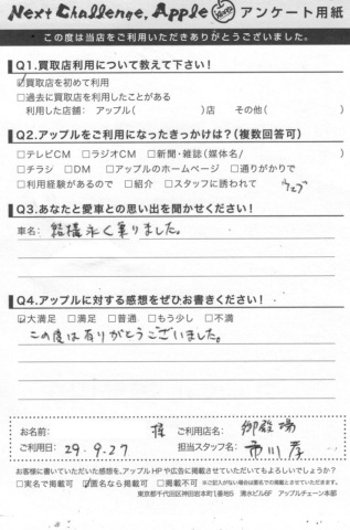 お車のご相談・ 査定だけでもOK! カンタン 入力 30秒 アップルがブランド買取始めました! お電話でも受付中! 受付時間10:00 ~ 18:00 0120-81-3776 お車のご相談・ 査定だけでもOK! カンタン 入力 30秒 アップルがブランド買取始めました! お電話でも受付中! 受付時間10:00 ~ 18:00 0120-81-3776 アップルがブランド買取始めました! お電話でも受付中! 受付時間10:00 ~ 18:00 0120-81-3776 店舗情報 在庫車 スタッフ紹介 ブログ お客様の声 キャンペーン 無料査定 click お客様の声 ご記入日: 2015/09/27 ハイゼットジャンボ ご購入 M.K様 ☆頂きましたアップルへのご感想・・大満足この度はありがとうございました。 前へ 次へ お客様の声一覧を見る