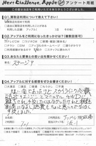 お車のご相談・ 査定だけでもOK! カンタン 入力 30秒 アップルがブランド買取始めました! お電話でも受付中! 受付時間10:00 ~ 18:00 0120-81-3776 お車のご相談・ 査定だけでもOK! カンタン 入力 30秒 アップルがブランド買取始めました! お電話でも受付中! 受付時間10:00 ~ 18:00 0120-81-3776 アップルがブランド買取始めました! お電話でも受付中! 受付時間10:00 ~ 18:00 0120-81-3776 店舗情報 在庫車 スタッフ紹介 ブログ お客様の声 キャンペーン 無料査定 click お客様の声 ご記入日: 2015/11/21 ステージア買取 K.S様 短い間であったけど、スカイラインの心臓RB25のエンジンとマニュアル4WDに魅了され、手放したくはなかったけど税金も割高になるし、燃費もちょっと悪いのでなくなく手放しました。 前へ 次へ お客様の声一覧を見る