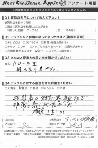 お車のご相談・ 査定だけでもOK! カンタン 入力 30秒 アップルがブランド買取始めました! お電話でも受付中! 受付時間10:00 ~ 18:00 0120-81-3776 お車のご相談・ 査定だけでもOK! カンタン 入力 30秒 アップルがブランド買取始めました! お電話でも受付中! 受付時間10:00 ~ 18:00 0120-81-3776 アップルがブランド買取始めました! お電話でも受付中! 受付時間10:00 ~ 18:00 0120-81-3776 店舗情報 在庫車 スタッフ紹介 ブログ お客様の声 キャンペーン 無料査定 click お客様の声 ご記入日: 2016/01/23 カローラⅡ買取 T.S様 頂きましたアップルに対する感想・・満足担当者の対応等親切で非常に感じが良かった満足しました担当 渋川 前へ 次へ お客様の声一覧を見る