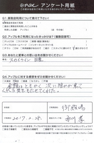 お車のご相談・ 査定だけでもOK! カンタン 入力 30秒 アップルがブランド買取始めました! お電話でも受付中! 受付時間10:00 ~ 18:00 0120-81-3776 お車のご相談・ 査定だけでもOK! カンタン 入力 30秒 アップルがブランド買取始めました! お電話でも受付中! 受付時間10:00 ~ 18:00 0120-81-3776 アップルがブランド買取始めました! お電話でも受付中! 受付時間10:00 ~ 18:00 0120-81-3776 店舗情報 在庫車 スタッフ紹介 ブログ お客様の声 キャンペーン 無料査定 click お客様の声 ご記入日: 2017/02/28 スカイラインクーペ買取 K様 ・アップルに頂きました感想・・満足金額はともかく、次に誰かが乗ってくれる気をもたせてくれた。担当・・市川 前へ 次へ お客様の声一覧を見る