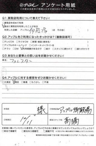 お車のご相談・ 査定だけでもOK! カンタン 入力 30秒 アップルがブランド買取始めました! お電話でも受付中! 受付時間10:00 ~ 18:00 0120-81-3776 お車のご相談・ 査定だけでもOK! カンタン 入力 30秒 アップルがブランド買取始めました! お電話でも受付中! 受付時間10:00 ~ 18:00 0120-81-3776 アップルがブランド買取始めました! お電話でも受付中! 受付時間10:00 ~ 18:00 0120-81-3776 店舗情報 在庫車 スタッフ紹介 ブログ お客様の声 キャンペーン 無料査定 click お客様の声 ご記入日: 2017/12/11 フォレスター買取 M.O様 ・アップルに頂きました感想・・満足担当 高橋 前へ 次へ お客様の声一覧を見る