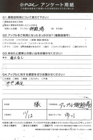 S様、いつもお話頂くと100%成約ありがとうございます。今回は、訳あってほとんど新古車の様な車をお任せ頂きました。また次回も頑張りますのでお待ちしています。