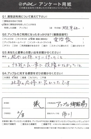 お車のご相談・ 査定だけでもOK! カンタン 入力 30秒 アップルがブランド買取始めました! お電話でも受付中! 受付時間10:00 ~ 18:00 0120-81-3776 お車のご相談・ 査定だけでもOK! カンタン 入力 30秒 アップルがブランド買取始めました! お電話でも受付中! 受付時間10:00 ~ 18:00 0120-81-3776 アップルがブランド買取始めました! お電話でも受付中! 受付時間10:00 ~ 18:00 0120-81-3776 店舗情報 在庫車 スタッフ紹介 ブログ お客様の声 キャンペーン 無料査定 click お客様の声 ご記入日: 2018/02/08 ラウム売却 A.S様 ・あなたと愛車との思い出をお聞かせ下さい・花や山菜とりに行ったこと・性能のよい車で故障がなかったこと・アップルに頂きました感想・・満足社員の対応が良かったです。担当 市川 前へ 次へ お客様の声一覧を見る