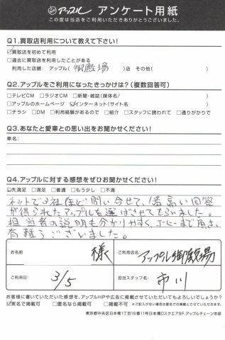 ネットで3社ほど問い合わせて、一番高い回答が得られたアップルを選ばせてもらいました。担当者の説明も分かりやすく、コーヒーまで頂きありがとうございました。