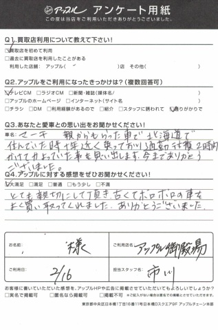 親からもらった車で北海道で住んでいた時十年近く乗っており通勤往復2時間かけて通っていた事を思い出します。今までありがとうございました。