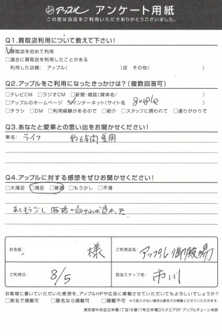 お車のご相談・ 査定だけでもOK! カンタン 入力 30秒 アップルがブランド買取始めました! お電話でも受付中! 受付時間10:00 ~ 18:00 0120-81-3776 お車のご相談・ 査定だけでもOK! カンタン 入力 30秒 アップルがブランド買取始めました! お電話でも受付中! 受付時間10:00 ~ 18:00 0120-81-3776 アップルがブランド買取始めました! お電話でも受付中! 受付時間10:00 ~ 18:00 0120-81-3776 店舗情報 在庫車 スタッフ紹介 ブログ お客様の声 キャンペーン 無料査定 click お客様の声 ご記入日: 2018/08/05 ライフ買取 S.T様 ・あなたと愛車との思い出をお聞かせ下さい!約6年使用・アップルに対する感想をぜひお聞かせください・・満足or普通あともう少し価格が高ければよかった担当 市川 前へ 次へ お客様の声一覧を見る
