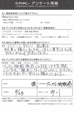 アップル御殿場店での対応は大変満足しています。親身になって心づかいおきづかい頂きました。安心して購入出来ました。