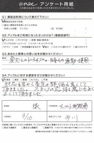 対応も早く査定の評価も高くして頂きました。スタッフの対応も感じもよくして頂きました。