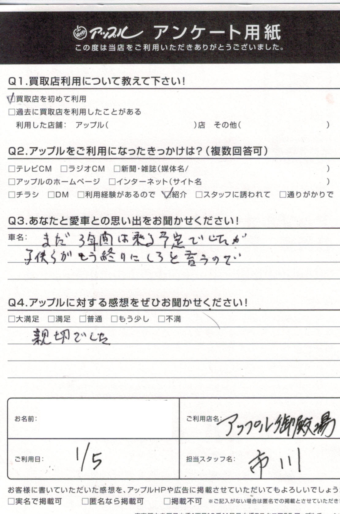 お車のご相談・ 査定だけでもOK! カンタン 入力 30秒 アップルがブランド買取始めました! お電話でも受付中! 受付時間10:00 ~ 18:00 0120-81-3776 お車のご相談・ 査定だけでもOK! カンタン 入力 30秒 アップルがブランド買取始めました! お電話でも受付中! 受付時間10:00 ~ 18:00 0120-81-3776 アップルがブランド買取始めました! お電話でも受付中! 受付時間10:00 ~ 18:00 0120-81-3776 店舗情報 在庫車 スタッフ紹介 ブログ お客様の声 キャンペーン 無料査定 click お客様の声 ご記入日: 2019/01/05 キャリイ 買取 S.I様 車名:スズキ キャリイ ・あなたと愛車との思い出をお聞かせ下さい。まだ3年間は乗る予定でしたが子供らがもう終わりにしろと言うので・アップルに対する感想をぜひお聞かせください親切でした担当 岩本 前へ 次へ お客様の声一覧を見る