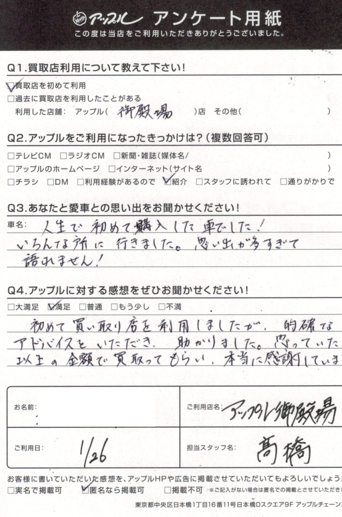 初めて買い取り店を利用しましたが、的確なアドバイスをいただき助かりました。思っていた以上の金額で買い取ってもらい、本当に感謝しています。
