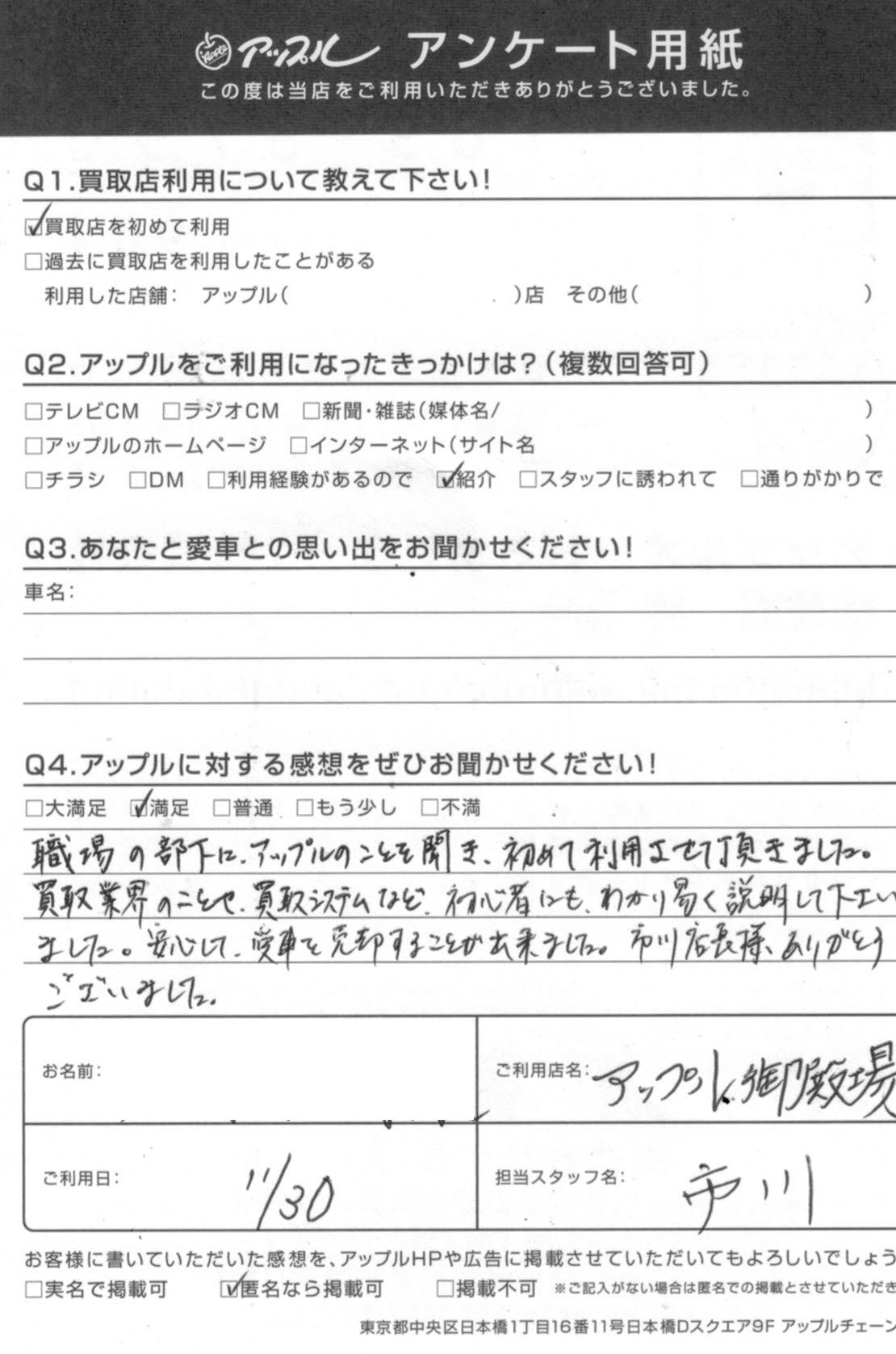 職場の部下にアップルの事を聞き、初めて利用させて頂きました。買取業界の事や買取システムなど、初心者にもわかり易く説明して下さいました。安心して愛車を売却することが出来ました。市川店長様、ありがとうございました。