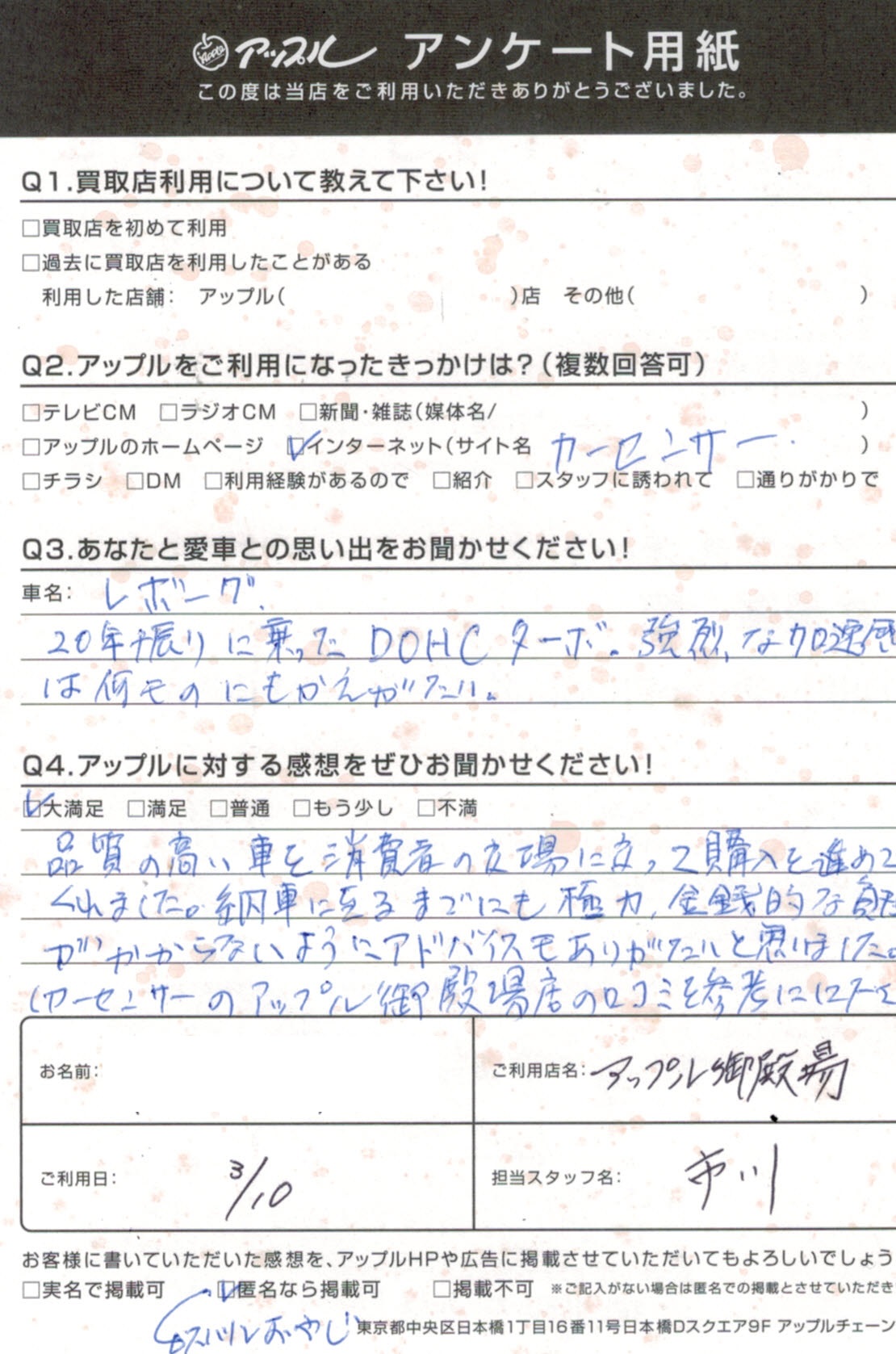 品質の良い車を、消費者の立場に立って購入を進めてくれました。納車に至るまでも極力金銭的な負担がかからないようにアドバイスもありがたいと思いました。(カーセンサーのアップル御殿場店の口コミを参考にしてください)