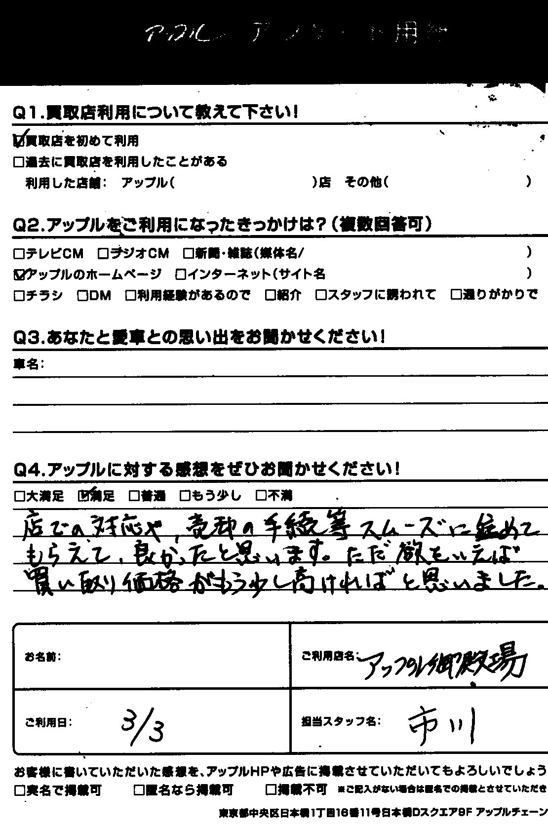 店での対応や、売却の手続き等スムーズに進めてもらえて、良かったと思います。ただ欲を言えば買取価格がもう少し高ければと思いました。