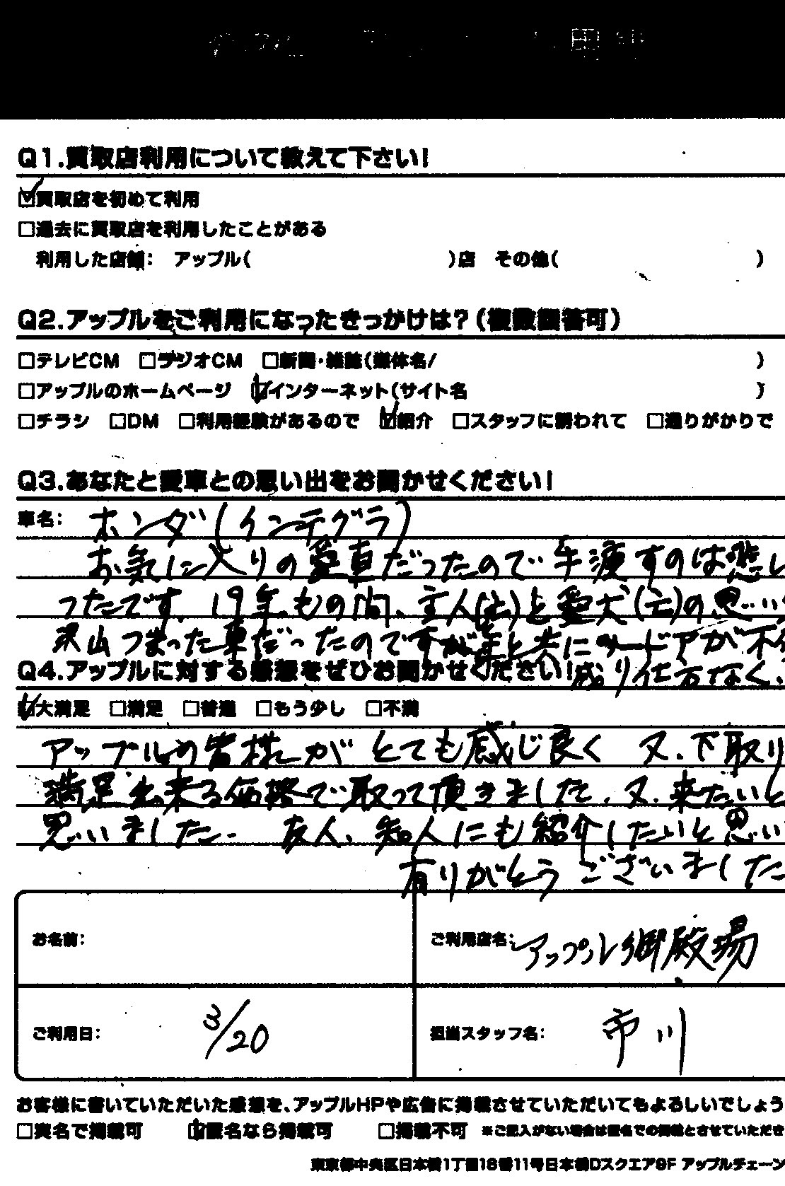 アップルの皆様がとても感じよく、又下取りも満足できる価格で取って頂きました。また来たいと思いました。知人友人にも紹介したいと思いました。有りがとうございました。