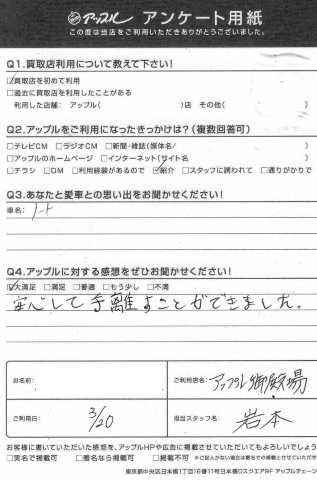 お車のご相談・ 査定だけでもOK! カンタン 入力 30秒 アップルがブランド買取始めました! お電話でも受付中! 受付時間10:00 ~ 18:00 0120-81-3776 お車のご相談・ 査定だけでもOK! カンタン 入力 30秒 アップルがブランド買取始めました! お電話でも受付中! 受付時間10:00 ~ 18:00 0120-81-3776 アップルがブランド買取始めました! お電話でも受付中! 受付時間10:00 ~ 18:00 0120-81-3776 店舗情報 在庫車 スタッフ紹介 ブログ お客様の声 キャンペーン 無料査定 click お客様の声 ご記入日: 2020/03/20 ノート買取 K・k様 車名:日産 ノート ・アップルに対する感想をぜひお聞かせください・・大満足安心して手放すことが出来ました担当 岩本 前へ 次へ お客様の声一覧を見る