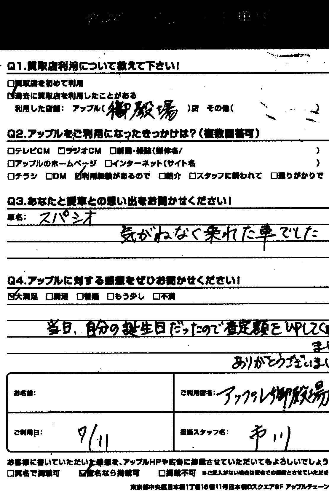 当日、自分の誕生日だったので査定額をアップしてくれました。ありがとうございました。