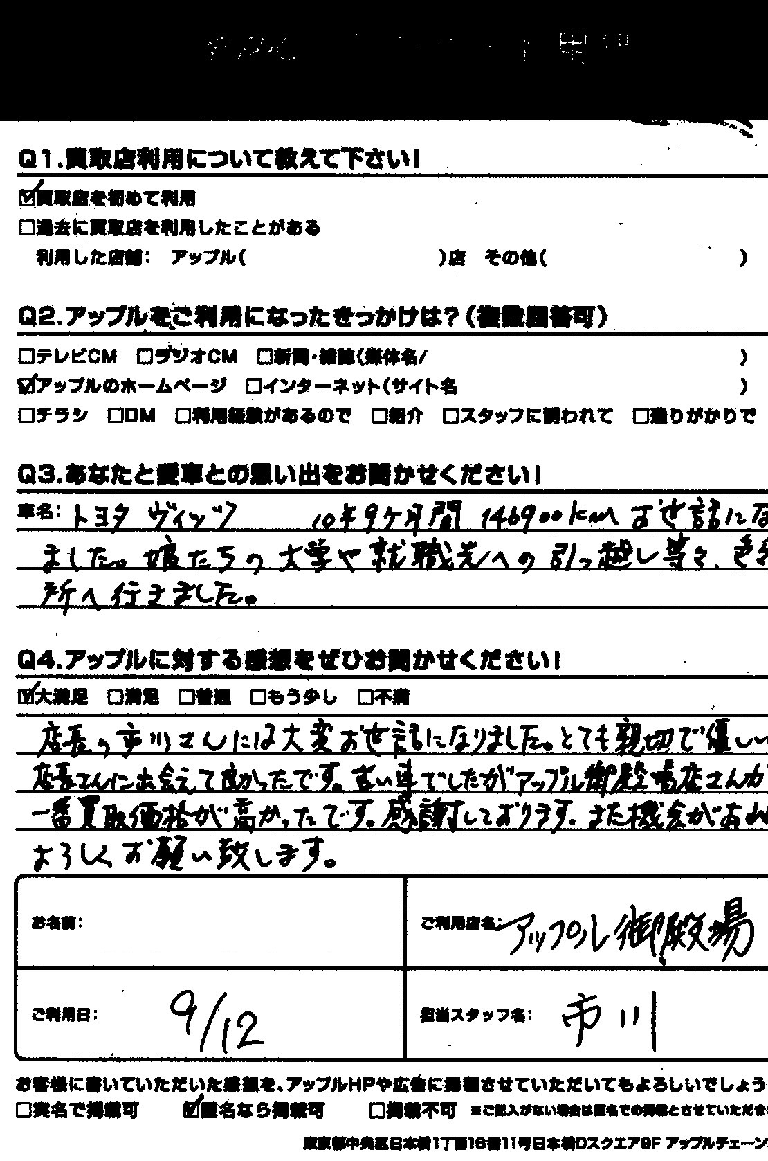 店長の市川さんには大変お世話になりました。とても親切で優しい店長さんに出会えて良かったです。古い車でしたがアップル御殿場店さんが一番買取価格が高かったです。感謝しております。また機会があれば宜しくお願いします。