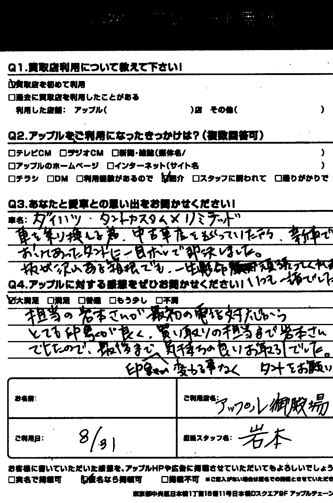 担当の岩本さんが最初の電話対応からとても印象が良く、買取の担当迄岩本さんでしたので、最後まで印象が変わることなく気持ちの良いお取引でした。タントをお願いします。
