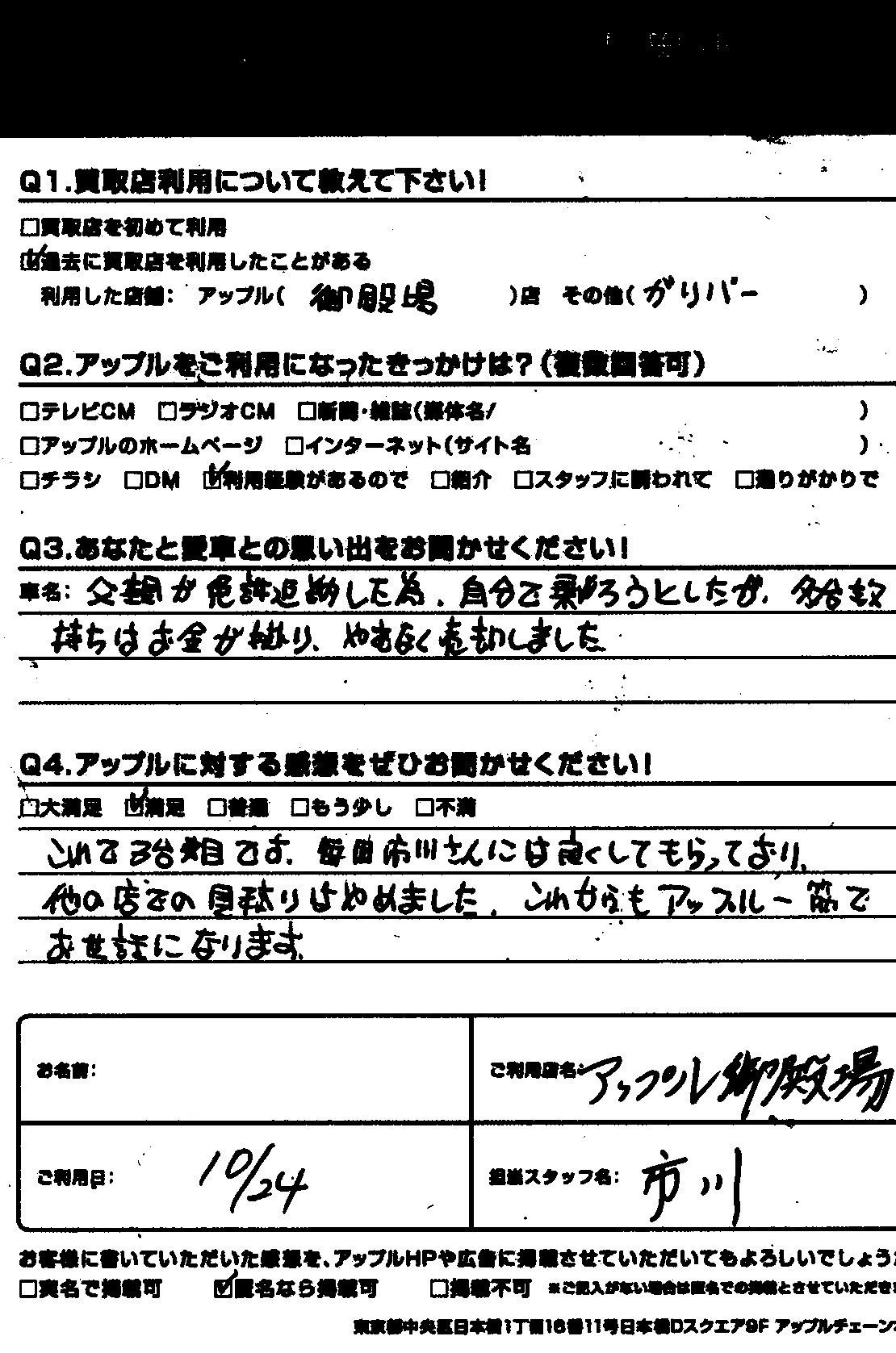 これで3台目です。毎回市川さんには良くしてもらっており、ほかの店での見積もりはやめました。これからもアップル一筋でお世話になります。