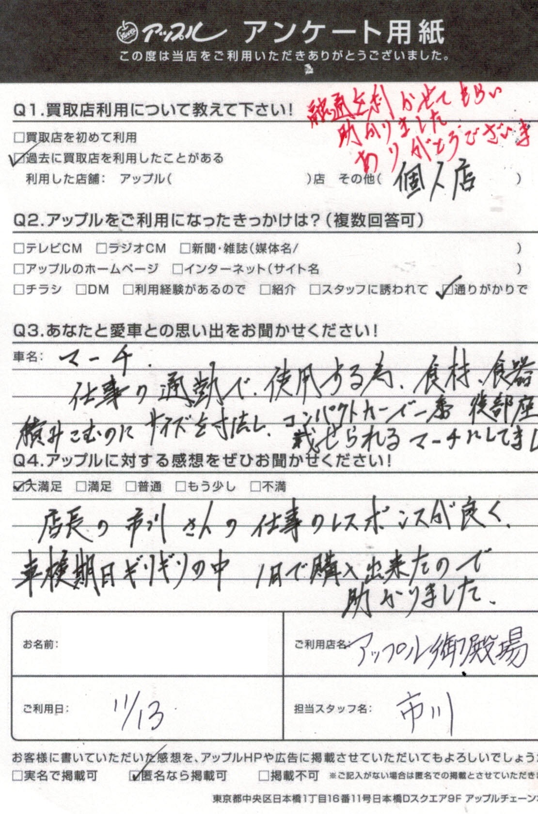 店長の市川さんの仕事のレスポンスが良く、車検期日ギリギリの中、一日で購入できたので助かりました。
