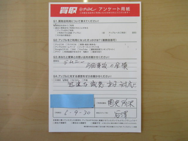 お車のご相談・ 査定だけでもOK! カンタン 入力 30秒 アップルがブランド買取始めました! お電話でも受付中! 受付時間10:00 ~ 19:00(火曜日は18:30までになります) 04-2933-3008 お車のご相談・ 査定だけでもOK! カンタン 入力 30秒 アップルがブランド買取始めました! お電話でも受付中! 受付時間10:00 ~ 19:00(火曜日は18:30までになります) 04-2933-3008 アップルがブランド買取始めました! お電話でも受付中! 受付時間10:00 ~ 19:00(火曜日は18:30までになります) 04-2933-3008 店舗情報 在庫車 スタッフ紹介 ブログ お客様の声 キャンペーン 無料査定 click お客様の声 ご記入日: 2023/09/30 T・Y様 車名:スズキ ジムニー 今回事故の全損アップルの感想:満足迅速な誠意ある対応 前へ 次へ お客様の声一覧を見る