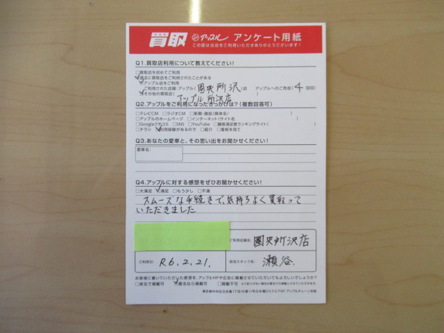 お車のご相談・ 査定だけでもOK! カンタン 入力 30秒 アップルがブランド買取始めました! お電話でも受付中! 受付時間10:00 ~ 19:00(火曜日は18:30までになります) 04-2933-3008 お車のご相談・ 査定だけでもOK! カンタン 入力 30秒 アップルがブランド買取始めました! お電話でも受付中! 受付時間10:00 ~ 19:00(火曜日は18:30までになります) 04-2933-3008 アップルがブランド買取始めました! お電話でも受付中! 受付時間10:00 ~ 19:00(火曜日は18:30までになります) 04-2933-3008 店舗情報 在庫車 スタッフ紹介 ブログ お客様の声 キャンペーン 無料査定 click お客様の声 ご記入日: 2024/02/21 K・K様 アップルの感想:満足スムーズな手続きで、気持ちよく買取っていただきました。 前へ 次へ お客様の声一覧を見る