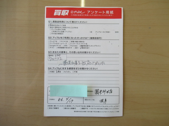 お車のご相談・ 査定だけでもOK! カンタン 入力 30秒 アップルがブランド買取始めました! お電話でも受付中! 受付時間10:00 ~ 19:00(火曜日は18:30までになります) 04-2933-3008 お車のご相談・ 査定だけでもOK! カンタン 入力 30秒 アップルがブランド買取始めました! お電話でも受付中! 受付時間10:00 ~ 19:00(火曜日は18:30までになります) 04-2933-3008 アップルがブランド買取始めました! お電話でも受付中! 受付時間10:00 ~ 19:00(火曜日は18:30までになります) 04-2933-3008 店舗情報 在庫車 スタッフ紹介 ブログ お客様の声 キャンペーン 無料査定 click お客様の声 ご記入日: 2024/04/17 R・K様 車名:トヨタ ウィッシュ 満足出来る対応であった。アップルの感想:満足 前へ 次へ お客様の声一覧を見る