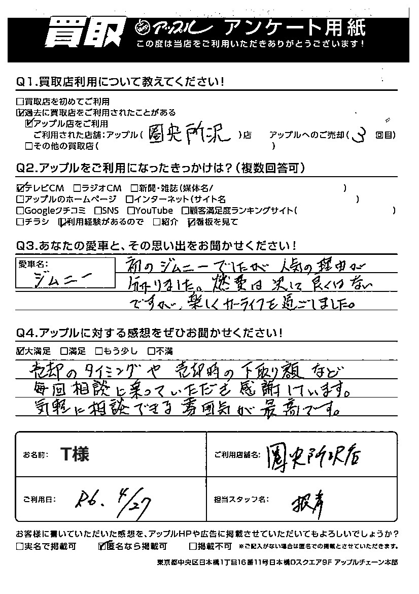 T様 車名:スズキ ジムニー