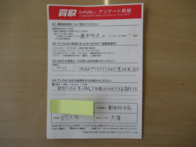 お車のご相談・ 査定だけでもOK! カンタン 入力 30秒 アップルがブランド買取始めました! お電話でも受付中! 受付時間10:00 ~ 19:00(火曜日は18:30までになります) 04-2933-3008 お車のご相談・ 査定だけでもOK! カンタン 入力 30秒 アップルがブランド買取始めました! お電話でも受付中! 受付時間10:00 ~ 19:00(火曜日は18:30までになります) 04-2933-3008 アップルがブランド買取始めました! お電話でも受付中! 受付時間10:00 ~ 19:00(火曜日は18:30までになります) 04-2933-3008 店舗情報 在庫車 スタッフ紹介 ブログ お客様の声 キャンペーン 無料査定 click お客様の声 ご記入日: 2025/03/20 A・I様 車名:トヨタ プリウス(2023年3月~のPHVを含む) 3代目のプリウスでしたので思い出もありました。アップルの感想:大満足紹介でしたが早い対応で処理していただき大変満足でした。 前へ 次へ お客様の声一覧を見る