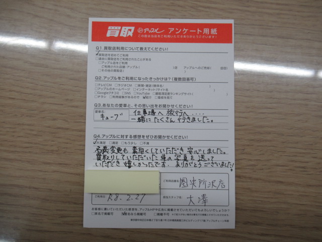 買取りしていただいた車の写真を送っていただき嬉しかったです。ありがとうございました!