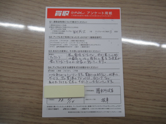 いつもありがとうございます。買取りはもちろん、代車のサービス、次に買う車のアドバイス、タイミングなど私のカーライフを完全にサポートいただいています。