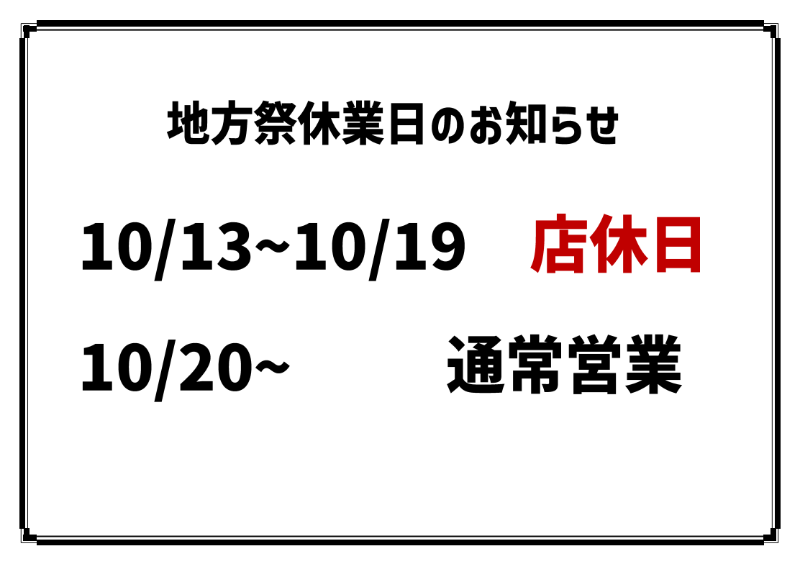 地方祭開催につき、10/13~10/19を店休日とさせていただきます。