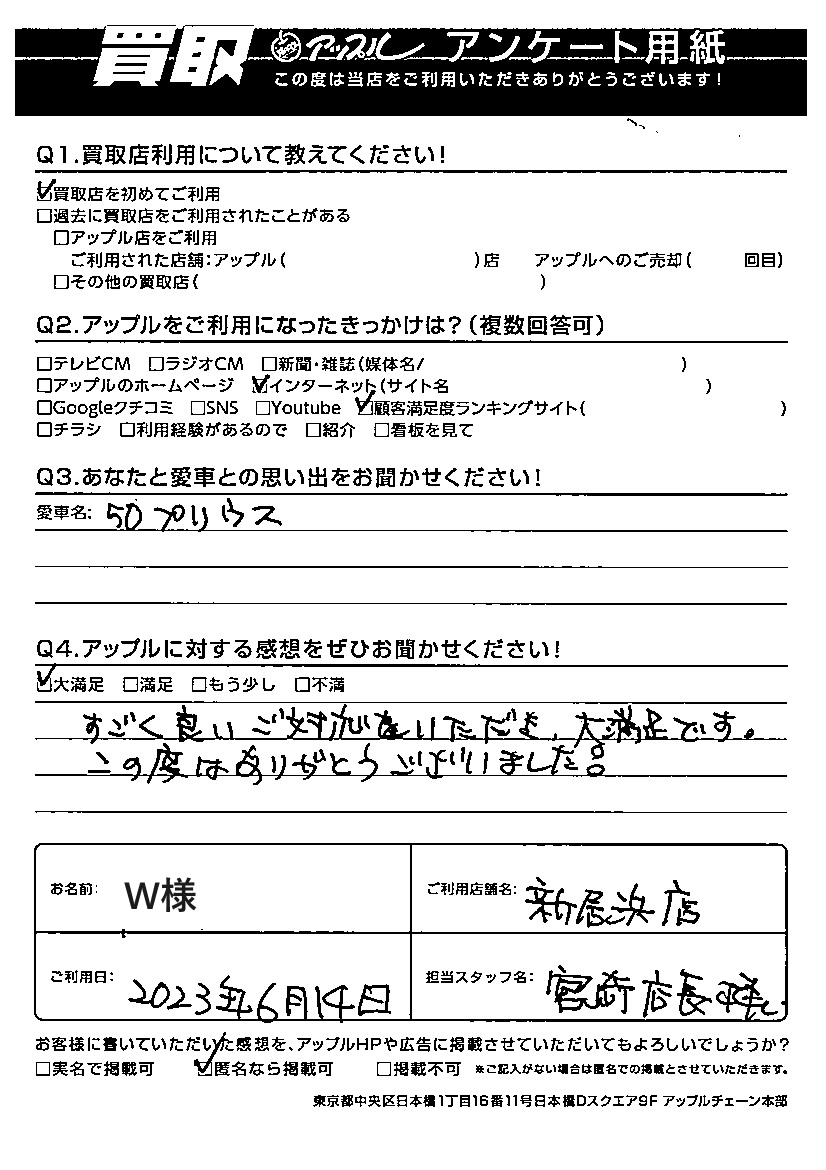 お車のご相談・ 査定だけでもOK! カンタン 入力 30秒 アップルがブランド買取始めました! お電話でも受付中! 受付時間10:00 ~ 19:00 0897-65-1880 お車のご相談・ 査定だけでもOK! カンタン 入力 30秒 アップルがブランド買取始めました! お電話でも受付中! 受付時間10:00 ~ 19:00 0897-65-1880 アップルがブランド買取始めました! お電話でも受付中! 受付時間10:00 ~ 19:00 0897-65-1880 店舗情報 在庫車 スタッフ紹介 ブログ お客様の声 キャンペーン お得 無料査定 click お客様の声 ご記入日: 2023/06/14 W様 車名:トヨタ プリウス(2023年3月~のPHVを含む) Q:アップルに対する感想をぜひお聞かせください!感想:大満足!すごく良いご対応をいただき、大満足です!この度はありがとうございました。担当:宮崎 前へ 次へ お客様の声一覧を見る