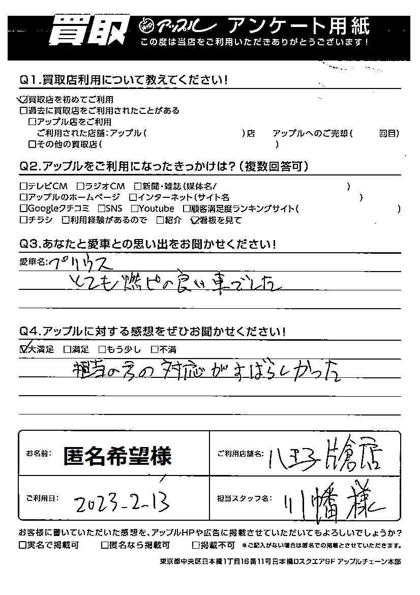 O様 車名:トヨタ プリウス(2023年3月~のPHVを含む)