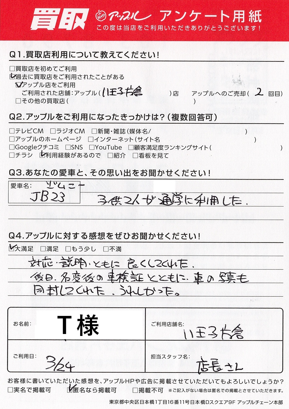 A4:大満足 対応・説明ともに良くしてくれた。後日、名義後の車検証とともに、車の写真も同封してくれた。うれしかった。