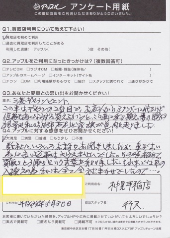思い出のつまったお車を当店にご売却頂きありがとうございます。今後もお客様に満足していただけるよう努力します。
