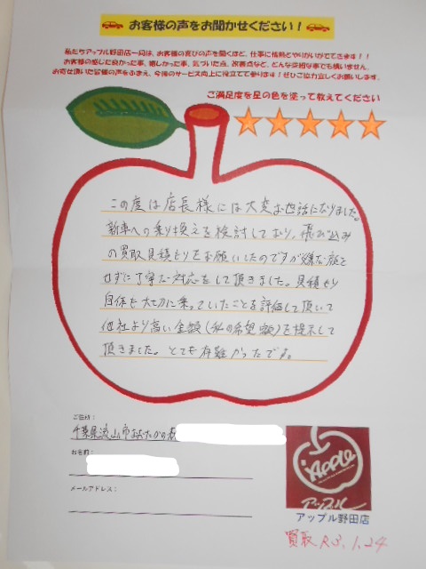 この度は店長様には大変お世話になりました。新車への乗り換えを検討しており、飛び込みの買取見積もりをお願いしたのですが嫌な顔をせずに丁寧な対応をして頂きました。見積もり自体も大切に乗っていたことを評価して頂いて他社より高い金額(私の希望額)を提示して頂きました。とても有難かったです。