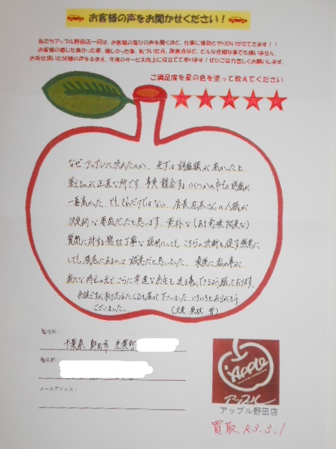 なぜアップルに決めたのか、先ずは評価額が高かったと答えるのが正直な所です。事実競合するいくつかの中での評価が一番高かった。でもそれだけではない。店長松本さんの人柄が決定的な要因だったと思います。素朴な(ある意味阿保な)質問に対する懇切丁寧な説明にしてもこちらの決断を促す熱意にしても根底にあるのは誠意だと思いました。最後に私の車が新たな持主の元でさらに幸運な余生を送る事ができるよう願っております。