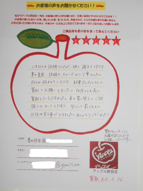 いきなりの訪問でしたが、快く迎えてくださり車の査定、説明もスムーズかつ丁寧でした。何日か悩ませていただき、結果アップルさんんへ買取をお願いしました。他店よりも高く買取していただきました。車の買い替えのご相談にものってくださり安心して最後までお任せする事ができました。ありがとうございました!