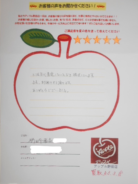 お車のご相談・ 査定だけでもOK! カンタン 入力 30秒 アップルがブランド買取始めました! お電話でも受付中! 受付時間10:00~19:00 04-7128-7217 お車のご相談・ 査定だけでもOK! カンタン 入力 30秒 アップルがブランド買取始めました! お電話でも受付中! 受付時間10:00~19:00 04-7128-7217 アップルがブランド買取始めました! お電話でも受付中! 受付時間10:00~19:00 04-7128-7217 店舗情報 在庫車 スタッフ紹介 ブログ お客様の声 キャンペーン お得 無料査定 click お客様の声 ご記入日: 2021/03/18 千葉県野田市 買取 T・F様 車名:ダイハツ タント 評価:★★★★★とても高く査定していただき満足してます。また利用させて頂きます。ありがとうございました。 前へ 次へ お客様の声一覧を見る