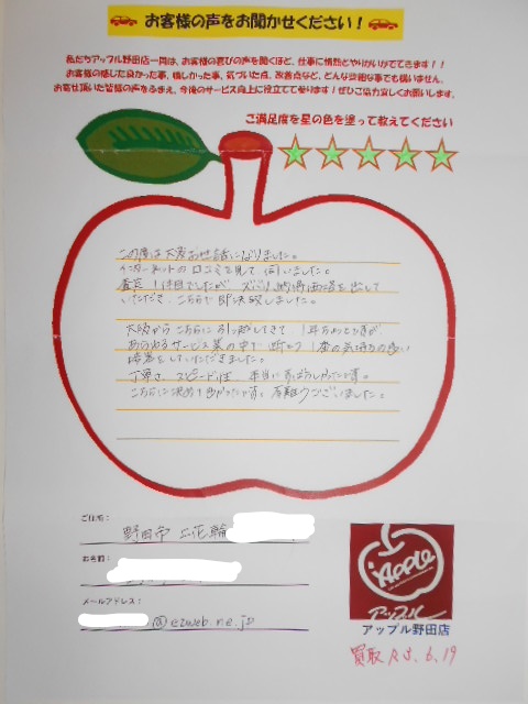 この度は大変お世話になりました。インターネットの口コミを見て伺いました。査定1件目でしたが、ズバリ納得価格を出していただき、こちらで即決致しました。大阪からこちらに引っ越してきて、1年ちょっとですが、あらゆるサービス業の中で断とつ1番の気持ちの良い接客をしていただきました。丁寧さ、スピード性、本当にすばらしかったです。こちらに決めて良かったです。有難うございました。