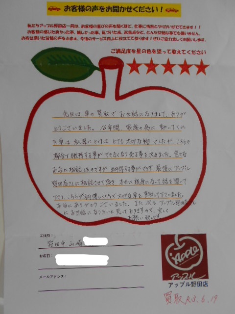 先日は車の買取でお世話になりましてありがとうございました。16年間、家族の為に動いてくれた車は私達にとってはとても大切な物でしたが、こちらの都合で維持する事ができなくなり売る事を決めました。色々なお店に相談したのですが、納得する事ができず、最後にアップル野田店さんに相談させて頂き本当に親身になって話を聞いて下さり、こちらが納得いく形で大切な車を買取して下さいました。本当にありがとうございました。また、次もアップル野田店さんにお世話になりたいと思っておりますので宜しくお願い致します。