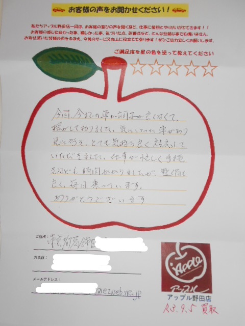 お車のご相談・ 査定だけでもOK! カンタン 入力 30秒 アップルがブランド買取始めました! お電話でも受付中! 受付時間10:00~19:00 04-7128-7217 お車のご相談・ 査定だけでもOK! カンタン 入力 30秒 アップルがブランド買取始めました! お電話でも受付中! 受付時間10:00~19:00 04-7128-7217 アップルがブランド買取始めました! お電話でも受付中! 受付時間10:00~19:00 04-7128-7217 店舗情報 在庫車 スタッフ紹介 ブログ お客様の声 キャンペーン お得 無料査定 click お客様の声 ご記入日: 2021/09/05 東京都葛飾区 買取 T・B様 車名:トヨタ マークⅡセダン(~H8年8月) 今回、今までの車が調子が良くなくて探しておりました。気にいった車があり見に行き、とても気持ち良く対応していただきました。仕事が忙しく手続きなども時間かかりましたが、整備も良く、毎日乗っています。ありがとうございました。 前へ 次へ お客様の声一覧を見る