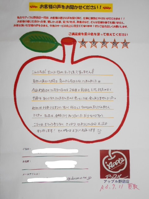 こんにちは!だいぶ日がたってしまってすいません!毎日があっという間で気づいたら今日になってしまいました。今回利用させていただいたのは2回目で前回もとても対応がよく料金もすぐにだしていただいたので悪いところは全くありませんでした。他社は料金でるまでにすごく話をしてなかなかだしてくれませんでした。私達は金額だけ知りたかっただけなのですがこちらはそういう事もなくさっぱりはっきりしているので又次回利用します!その時はよろしくお願いします。