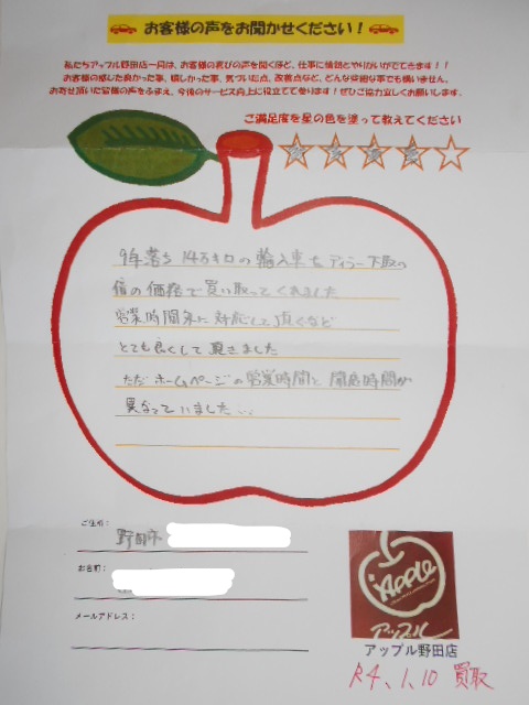 お車のご相談・ 査定だけでもOK! カンタン 入力 30秒 アップルがブランド買取始めました! お電話でも受付中! 受付時間10:00~19:00 04-7128-7217 お車のご相談・ 査定だけでもOK! カンタン 入力 30秒 アップルがブランド買取始めました! お電話でも受付中! 受付時間10:00~19:00 04-7128-7217 アップルがブランド買取始めました! お電話でも受付中! 受付時間10:00~19:00 04-7128-7217 店舗情報 在庫車 スタッフ紹介 ブログ お客様の声 キャンペーン お得 無料査定 click お客様の声 ご記入日: 2022/01/10 千葉県野田市 買取 Y・Y様 車名:プジョー 208 評価:★★★★9年落ち14万キロの輸入車をディーラー下取の倍の価格で買い取ってくれました。営業時間外に対応して頂くなどとても良くして頂きました。ただ、ホームページの営業時間と開店時間が異なっていました・・・。 前へ 次へ お客様の声一覧を見る