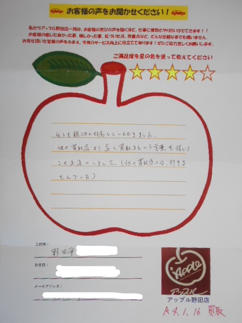お車のご相談・ 査定だけでもOK! カンタン 入力 30秒 アップルがブランド買取始めました! お電話でも受付中! 受付時間10:00~19:00 04-7128-7217 お車のご相談・ 査定だけでもOK! カンタン 入力 30秒 アップルがブランド買取始めました! お電話でも受付中! 受付時間10:00~19:00 04-7128-7217 アップルがブランド買取始めました! お電話でも受付中! 受付時間10:00~19:00 04-7128-7217 店舗情報 在庫車 スタッフ紹介 ブログ お客様の声 キャンペーン お得 無料査定 click お客様の声 ご記入日: 2022/01/16 千葉県野田市 買取 Y・I様 車名:トヨタ bB 評価:★★★★とても親切に対応していただきました。他の買取店より高く買取るという言葉を信じてこのお店にしました。(他の買取店には行きませんでした。) 前へ 次へ お客様の声一覧を見る