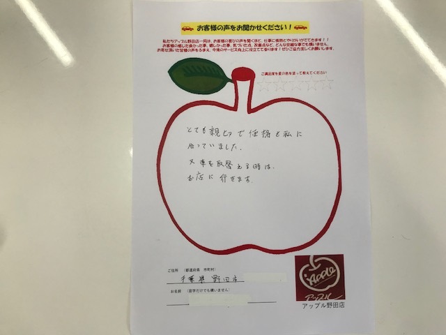 お車のご相談・ 査定だけでもOK! カンタン 入力 30秒 アップルがブランド買取始めました! お電話でも受付中! 受付時間10:00~19:00 04-7128-7217 お車のご相談・ 査定だけでもOK! カンタン 入力 30秒 アップルがブランド買取始めました! お電話でも受付中! 受付時間10:00~19:00 04-7128-7217 アップルがブランド買取始めました! お電話でも受付中! 受付時間10:00~19:00 04-7128-7217 店舗情報 在庫車 スタッフ紹介 ブログ お客様の声 キャンペーン お得 無料査定 click お客様の声 ご記入日: 2018/10/29 S様 とても親切で価格も私に合っていました。又、車を取替える時は、お店に行きます。 前へ 次へ お客様の声一覧を見る