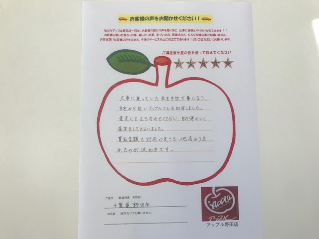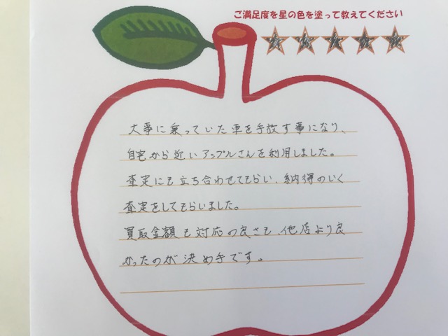 お車のご相談・ 査定だけでもOK! カンタン 入力 30秒 アップルがブランド買取始めました! お電話でも受付中! 受付時間10:00~19:00 04-7128-7217 お車のご相談・ 査定だけでもOK! カンタン 入力 30秒 アップルがブランド買取始めました! お電話でも受付中! 受付時間10:00~19:00 04-7128-7217 アップルがブランド買取始めました! お電話でも受付中! 受付時間10:00~19:00 04-7128-7217 店舗情報 在庫車 スタッフ紹介 ブログ お客様の声 キャンペーン お得 無料査定 click お客様の声 ご記入日: 2019/02/07 千葉県野田市 買取 K様 車名:トヨタ アルファード(H27年1月~のHYBRID含む) 大事に乗っていた車を手放す事になり、自宅から近いアップルさんを利用しました。査定にも立ち会わせてもらい、納得のいく査定をしてもらいました。買取金額も対応の良さも、他店より良かったのが決め手です。 前へ 次へ お客様の声一覧を見る