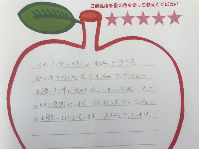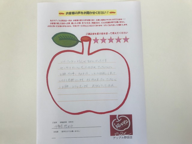 お車のご相談・ 査定だけでもOK! カンタン 入力 30秒 アップルがブランド買取始めました! お電話でも受付中! 受付時間10:00~19:00 04-7128-7217 お車のご相談・ 査定だけでもOK! カンタン 入力 30秒 アップルがブランド買取始めました! お電話でも受付中! 受付時間10:00~19:00 04-7128-7217 アップルがブランド買取始めました! お電話でも受付中! 受付時間10:00~19:00 04-7128-7217 店舗情報 在庫車 スタッフ紹介 ブログ お客様の声 キャンペーン お得 無料査定 click お客様の声 ご記入日: 2019/03/04 千葉県野田市 買取 M様 車名:レクサス スタッフの方の対応がすばらしかったです。他の所にも行こうと思っていましたがアップルさんにお願いする事に決めました。いろいろ相談にも乗っていただき感謝しています。また何かあったらアップルさんにお願いしようと思います。ありがとうございました。 前へ 次へ お客様の声一覧を見る