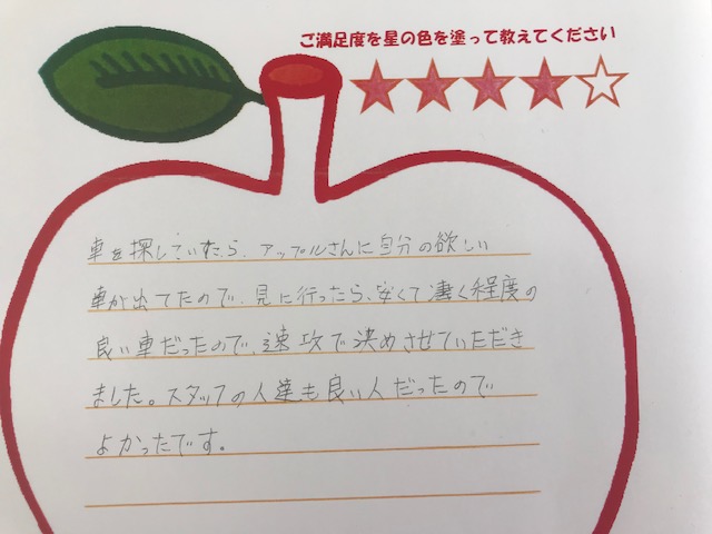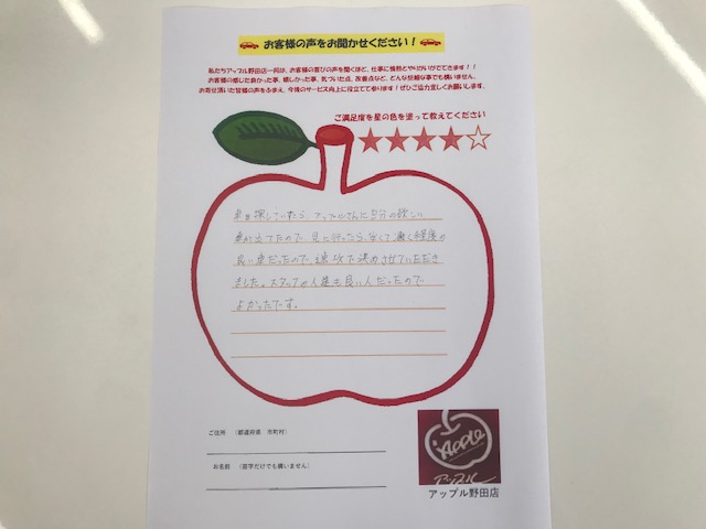 お車のご相談・ 査定だけでもOK! カンタン 入力 30秒 アップルがブランド買取始めました! お電話でも受付中! 受付時間10:00~19:00 04-7128-7217 お車のご相談・ 査定だけでもOK! カンタン 入力 30秒 アップルがブランド買取始めました! お電話でも受付中! 受付時間10:00~19:00 04-7128-7217 アップルがブランド買取始めました! お電話でも受付中! 受付時間10:00~19:00 04-7128-7217 店舗情報 在庫車 スタッフ紹介 ブログ お客様の声 キャンペーン お得 無料査定 click お客様の声 ご記入日: 2019/03/08 東京都足立区 販売 I様 車名:トヨタ 車を探していたら、アップルさんに自分の欲しい車が出ていたので、見に行ったら、安くて凄く程度の良い車だったので、速攻で決めさせていただきました。スタッフの人達も良い人だったのでよかったです。 前へ 次へ お客様の声一覧を見る